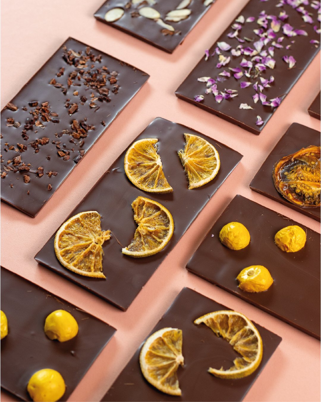 Pequeños bocados de chocolate con sabores únicos como café, uchuva, mango y...
